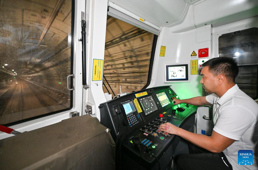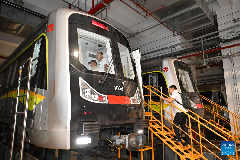 A Kazakh trainee (R) gets on a subway train for taking a test during a light-rail driver training session in north China's Tianjin Municipality, Sept. 5, 2025. A batch of 29 drivers from Kazakhstan have recently qualified as light-rail drivers after finishing immersive training sessions in China's Tianjin. (Xinhua/Sun Fanyue)