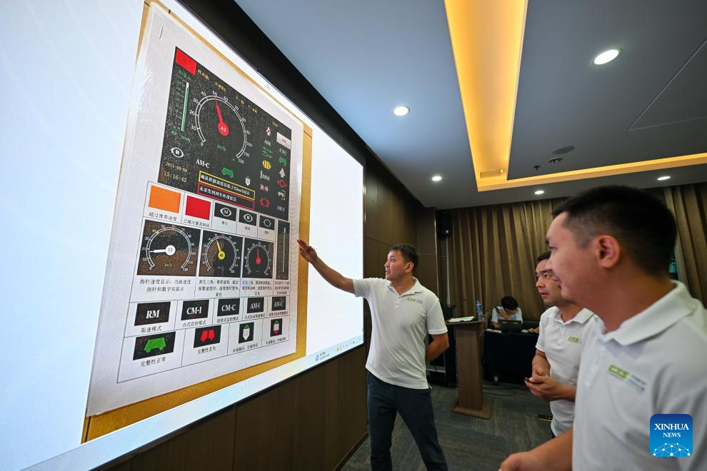 A Kazakh trainee takes a test during a light-rail driver training session in north China's Tianjin Municipality, Sept. 5, 2025. A batch of 29 drivers from Kazakhstan have recently qualified as light-rail drivers after finishing immersive training sessions in China's Tianjin. (Xinhua/Sun Fanyue)