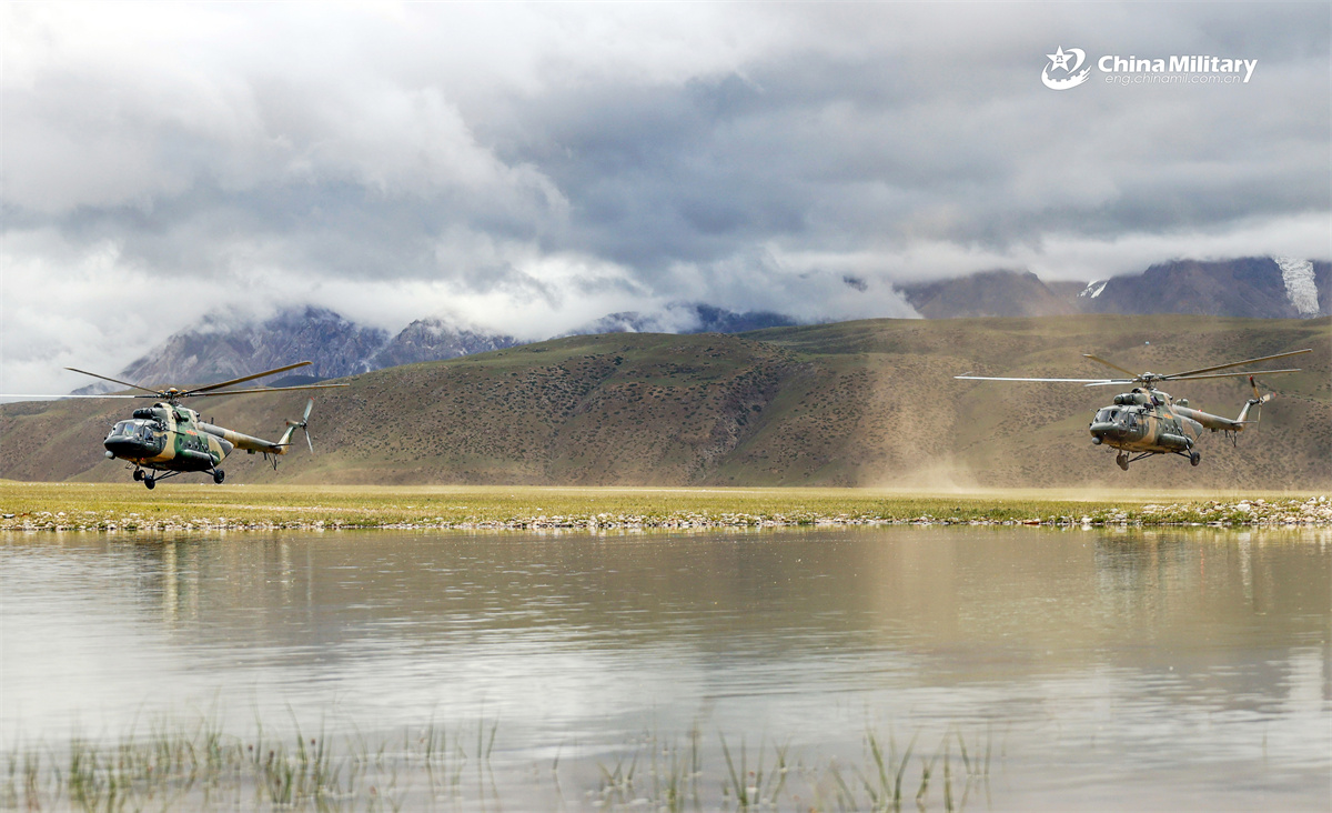 Two Mi-17 transport helicopters attached to an army aviation brigade under the Chinese PLA Army skim low over the lake surface during a field flight training exercise. (eng.chinamil.com.cn/Photo by Hu Qiwu)