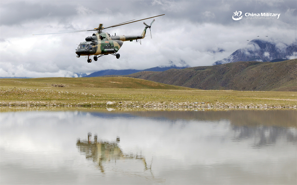 A Mi-17 transport helicopter attached to an army aviation brigade under the Chinese PLA Army hovers at an ultra-low altitude during a field flight training exercise. (eng.chinamil.com.cn/Photo by Hu Qiwu)