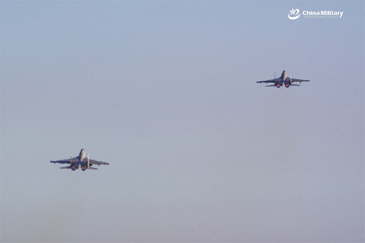 Two J-16 fighter jets attached to the air force under the Chinese PLA Eastern Theater Command soar into the sky during a flight training exercise. (eng.chinamil.com.cn/Photo by Xiong Wei)