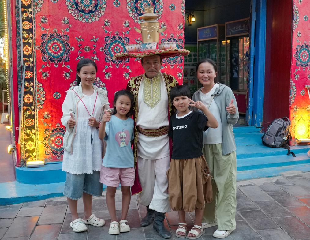 Parhat Emin (C) poses for a photo with tourists after performing the Samawar dance in the Qiuci Alley of Kuqa City, northwest China's Xinjiang Uygur Autonomous Region, July 22, 2025. In the Qiuci Alley of Kuqa City, northwest China's Xinjiang Uygur Autonomous Region, Parhat Emin performs the Samawar (a Uygur term meaning "tea set") dance, a traditional Uygur greeting dance with a history dating back to the millennium-old ancient Qiuci State. His eyes shine brightly, and his smile is warm and welcoming. With a bronze pot and porcelain bowls balanced steadily on a plate over his head, his body spins smoothly, and his feet move as lightly as the wind. As he dances gracefully to the rhythm of traditional Uygur music, the surrounding audience burst into cheers from time to time. (Xinhua/Wang Jingqiang)