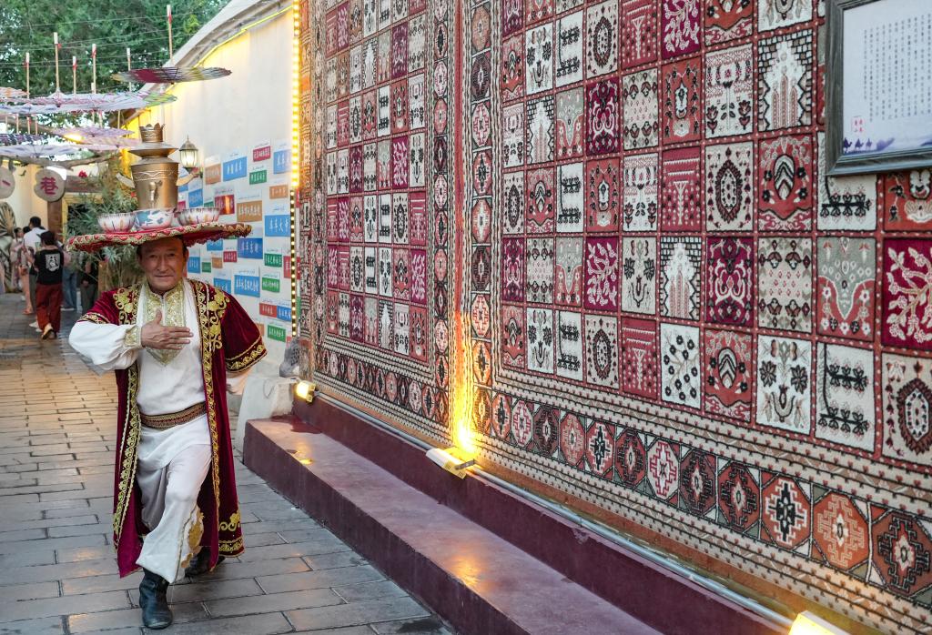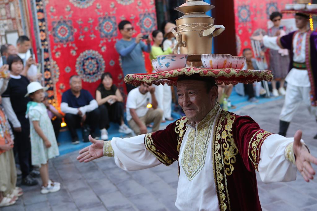 This photo shows a view of the Qiuci Alley of Kuqa City, northwest China's Xinjiang Uygur Autonomous Region, July 22, 2025. In the Qiuci Alley of Kuqa City, northwest China's Xinjiang Uygur Autonomous Region, Parhat Emin performs the Samawar (a Uygur term meaning "tea set") dance, a traditional Uygur greeting dance with a history dating back to the millennium-old ancient Qiuci State. His eyes shine brightly, and his smile is warm and welcoming. With a bronze pot and porcelain bowls balanced steadily on a plate over his head, his body spins smoothly, and his feet move as lightly as the wind. As he dances gracefully to the rhythm of traditional Uygur music, the surrounding audience burst into cheers from time to time. (Xinhua/Wang Jingqiang)
