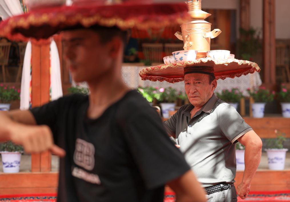 Parhat Emin takes a break in the Qiuci Alley of Kuqa City, northwest China's Xinjiang Uygur Autonomous Region, July 22, 2025. In the Qiuci Alley of Kuqa City, northwest China's Xinjiang Uygur Autonomous Region, Parhat Emin performs the Samawar (a Uygur term meaning "tea set") dance, a traditional Uygur greeting dance with a history dating back to the millennium-old ancient Qiuci State. His eyes shine brightly, and his smile is warm and welcoming. With a bronze pot and porcelain bowls balanced steadily on a plate over his head, his body spins smoothly, and his feet move as lightly as the wind. As he dances gracefully to the rhythm of traditional Uygur music, the surrounding audience burst into cheers from time to time. (Xinhua/Wang Fei)