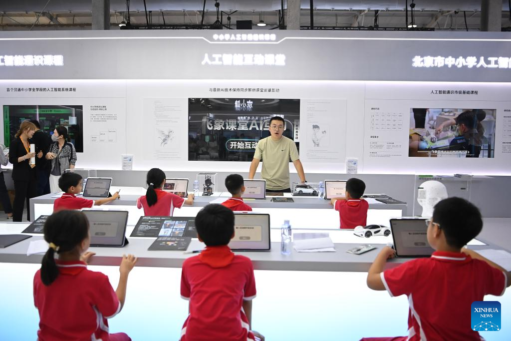 Students have a class in an artificial intelligence interactive classroom at the 2025 China International Fair for Trade in Services (CIFTIS) in Beijing, capital of China, Sept. 11, 2025. The 2025 CIFTIS opened in Beijing on Wednesday, themed "Embrace Intelligent Technologies, Empower Trade in Services." (Xinhua/Xiao Xiao)