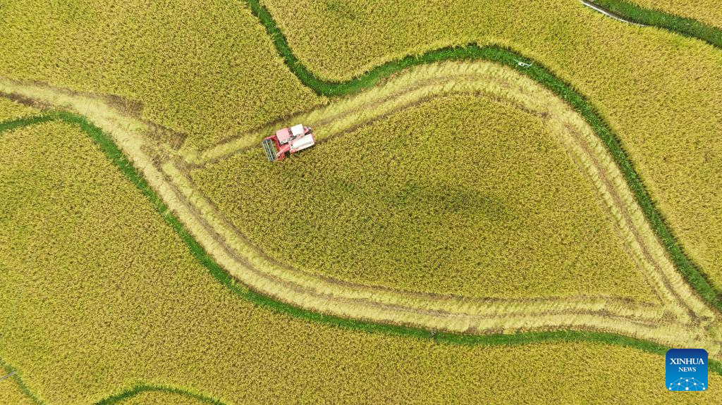 An aerial drone photo shows harvester working in a field in Wangcao Town of Suiyang County, southwest China's Guizhou Province, Sept. 11, 2025. (Photo by Li Qianyong/Xinhua)