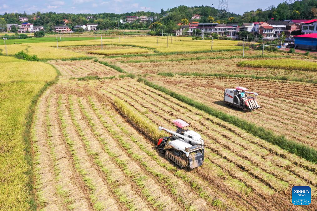 A drone photo shows farmers harvesting rice in Shitan Township of Hengdong County in Hengyang City, central China's Hunan Province, Sept. 11, 2025. (Photo by Cao Zhengping/Xinhua)