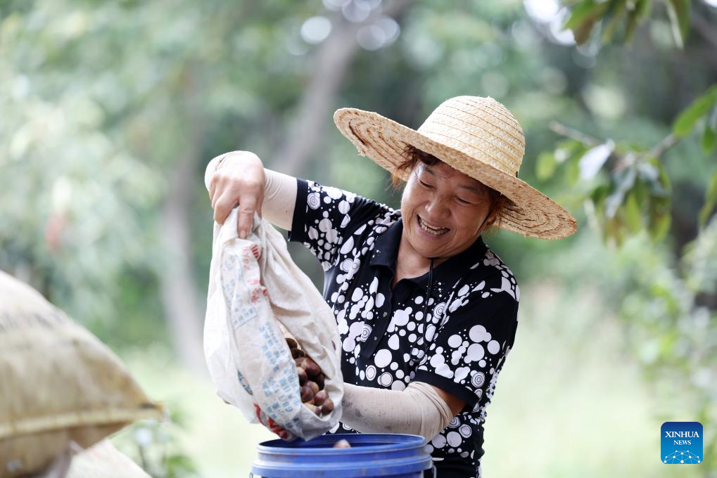 A villager sorts harvested chestnuts in Tancheng County of Linyi City, east China's Shandong Province, Sept. 11, 2025. (Photo by Zhang Chunlei/Xinhua)