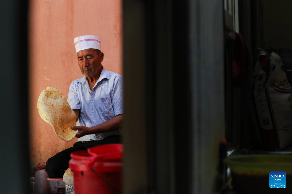 Rishit Himit makes naans at his store in Kuqa City, northwest China's Xinjiang Uygur Autonomous Region, July 22, 2025. (Xinhua/Wang Fei)