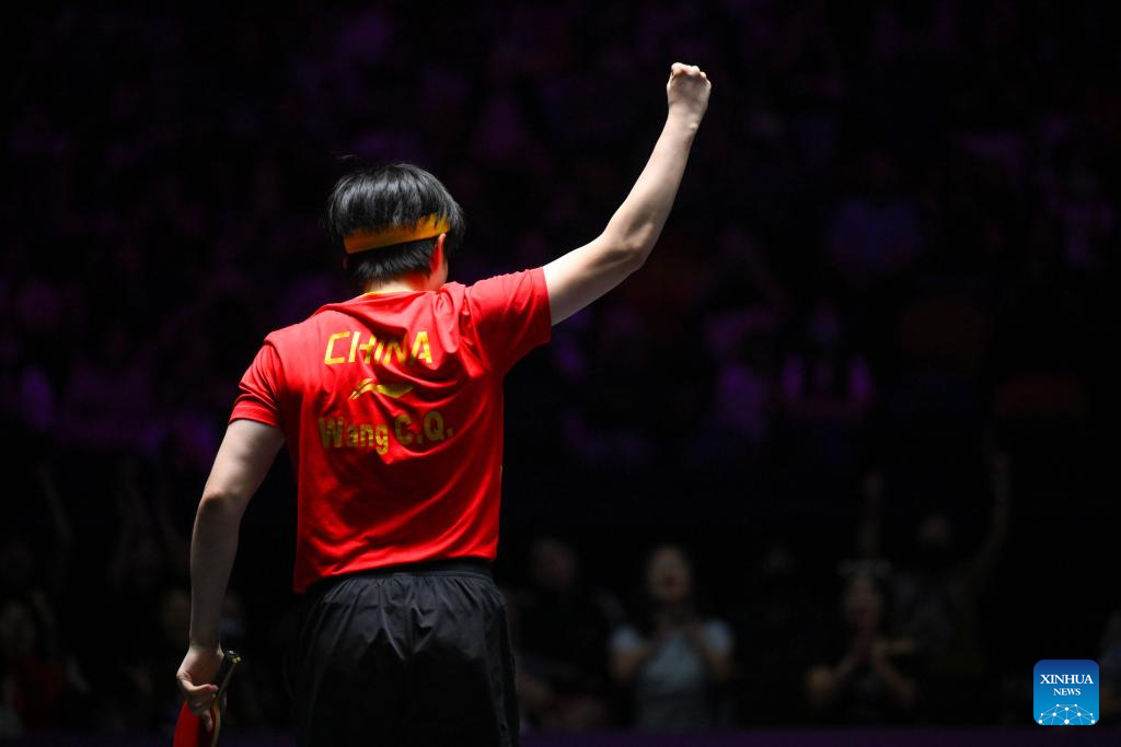 Wang Chuqin of China competes during the men's singles round of 16 match against Jonathan Groth of Denmark at the 2025 World Table Tennis (WTT) Champions Macao in Macao, south China, Sept. 11, 2025. (Xinhua/Cheong Kam Ka)