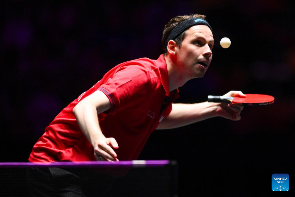 Jonathan Groth of Denmark competes during the men's singles round of 16 match against Wang Chuqin of China at the 2025 World Table Tennis (WTT) Champions Macao in Macao, south China, Sept. 11, 2025. (Xinhua/Cheong Kam Ka)