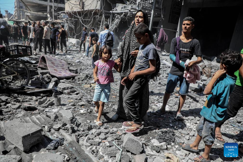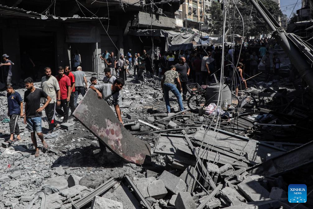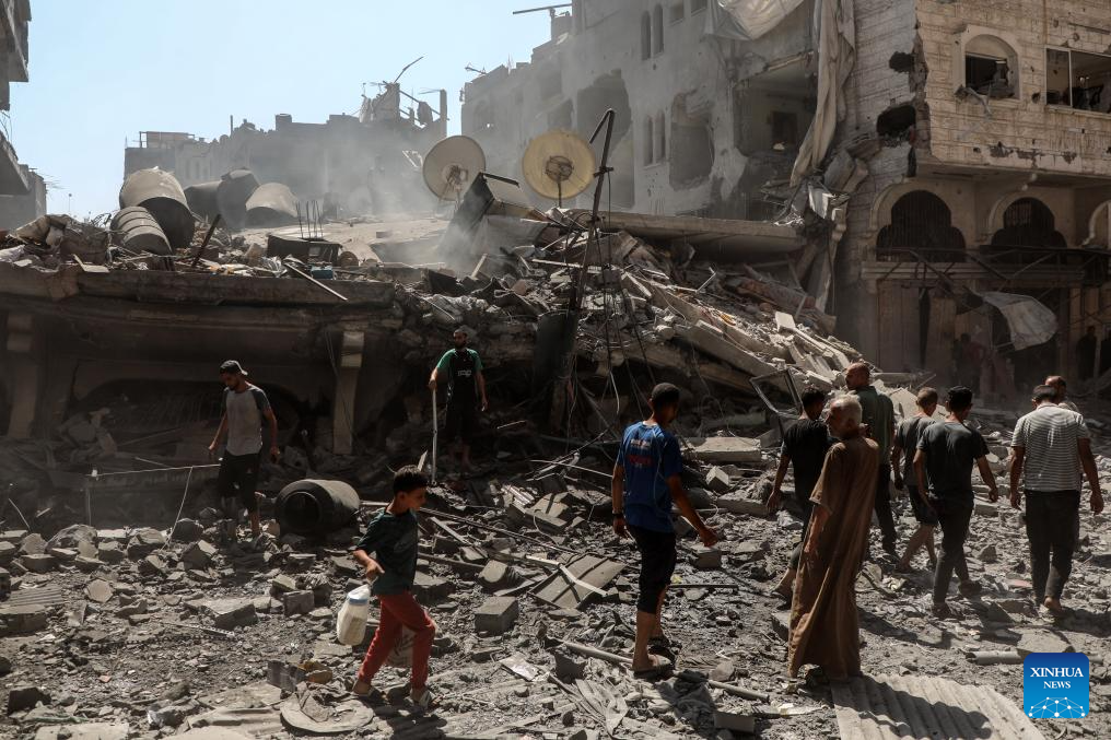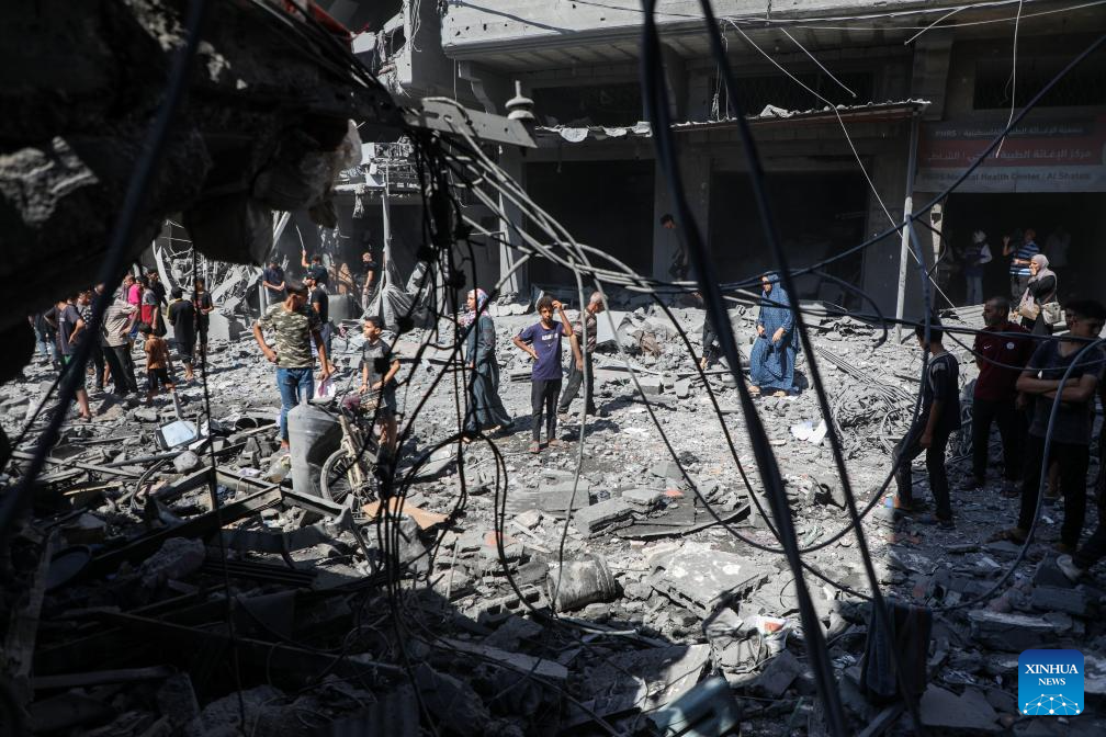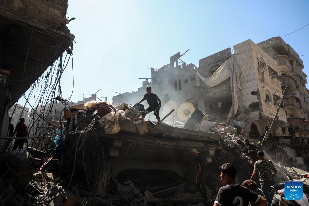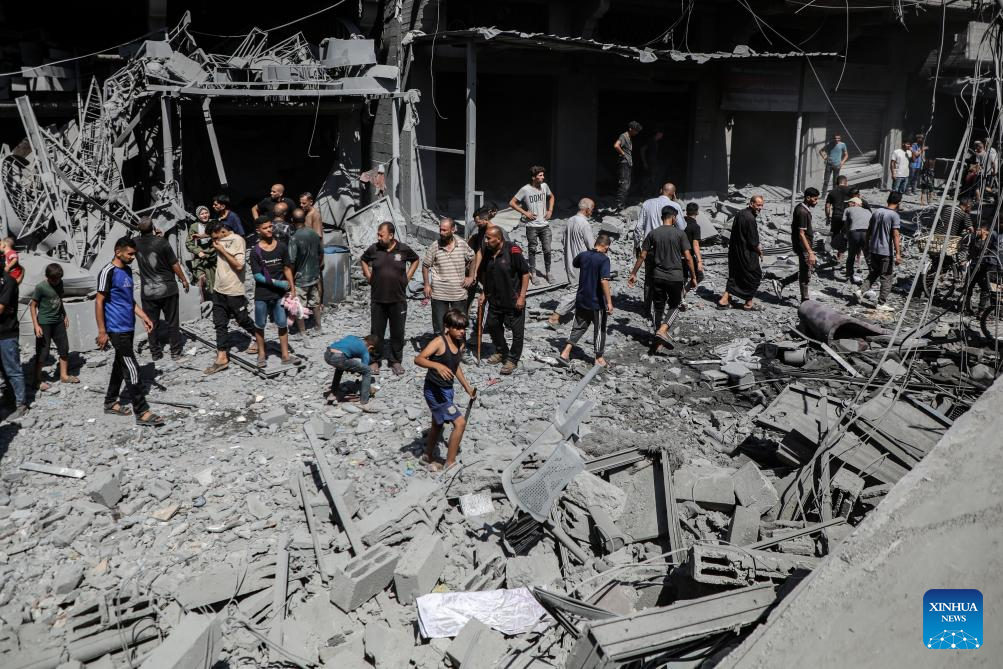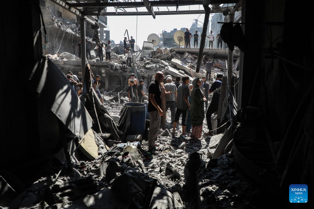 Palestinians inspect the damage to several houses inside the Shati refugee camp, west of Gaza City, after an Israeli airstrike, Sept. 11, 2025. (Photo by Rizek Abdeljawad/Xinhua)