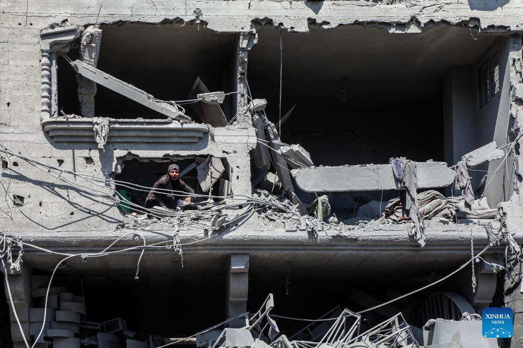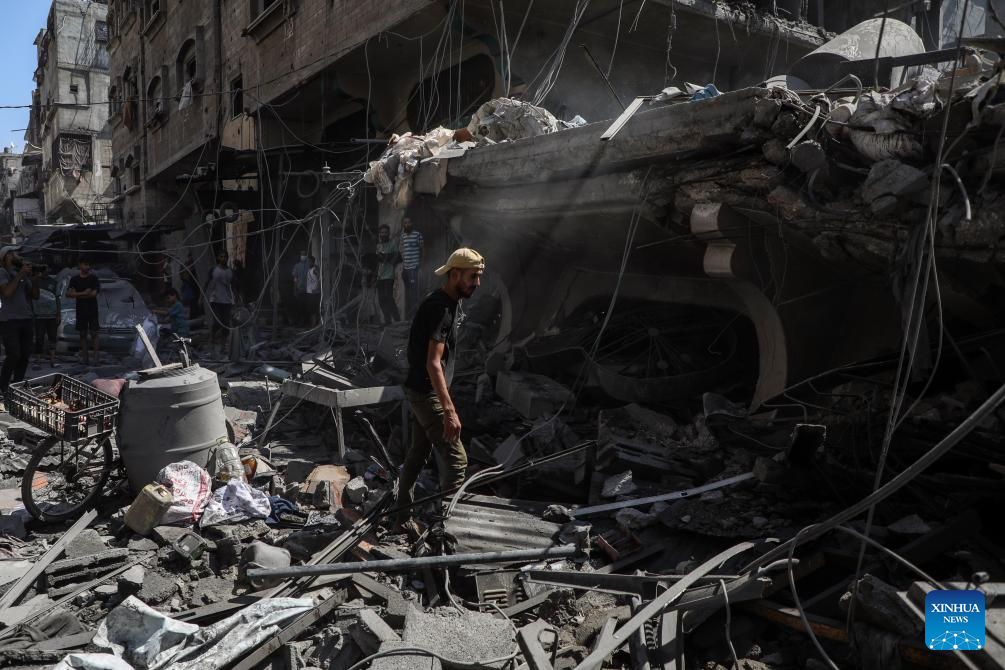 A Palestinian inspects the damage to several houses inside the Shati refugee camp, west of Gaza City, after an Israeli airstrike, Sept. 11, 2025. (Photo by Rizek Abdeljawad/Xinhua)