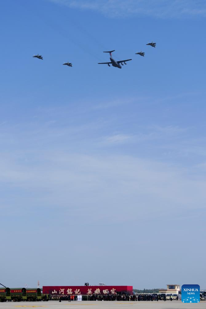 A Chinese People's Liberation Army (PLA) Air Force Y-20 transport aircraft carrying the remains of Chinese People's Volunteers (CPV) martyrs, escorted by four J-20 fighter jets, is pictured in Shenyang, capital of northeast China's Liaoning Province, on Sept. 12, 2025. The remains of 30 Chinese People's Volunteers (CPV) soldiers who lost their lives during the War to Resist U.S. Aggression and Aid Korea (1950-1953) were returned to China on Friday from the Republic of Korea (ROK). (Xinhua/Pan Yulong)