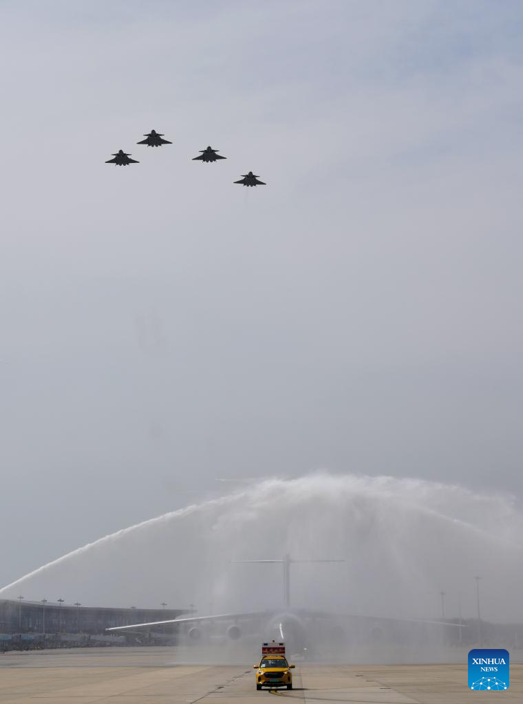 After it entered China's airspace, the Y-20 transport aircraft was escorted by four J-20 fighter jets. Upon landing at the airport, it was given a water salute.