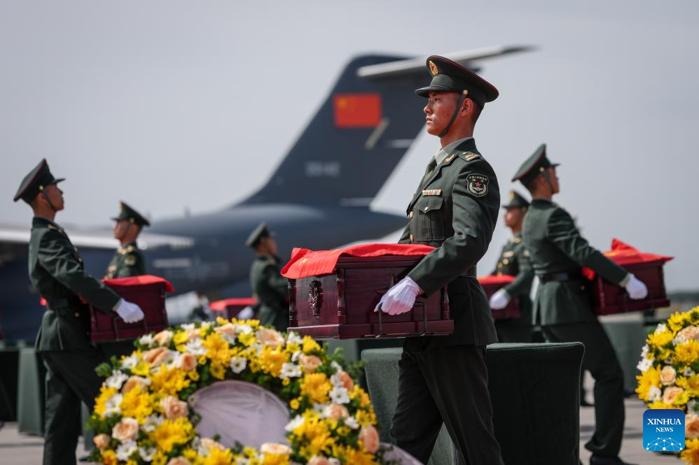 A Chinese People's Liberation Army Air Force Y-20 transport aircraft, carrying the remains of the martyrs and 267 items of related artifacts, landed at Taoxian International Airport in Shenyang, capital of northeast China's Liaoning Province.