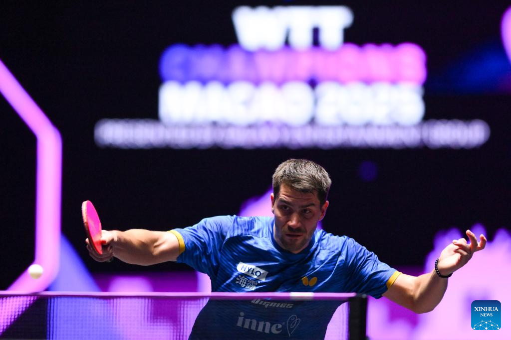 Patrick Franziska of Germany hits a return during the men's singles round of 16 match against Quadri Aruna of Nigeria at the 2025 World Table Tennis (WTT) Champions Macao in Macao, south China, Sept. 12, 2025. (Xinhua/Cheong Kam Ka)