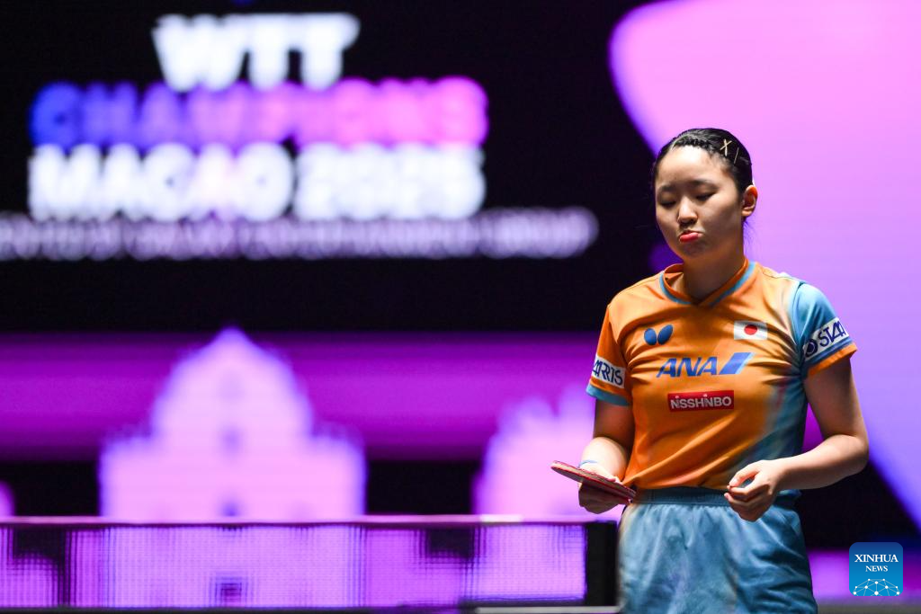 Odo Satsuki of Japan hits a return during the women's singles round of 16 match against Harimoto Miwa of Japan at the 2025 World Table Tennis (WTT) Champions Macao in Macao, south China, Sept. 12, 2025. (Xinhua/Cheong Kam Ka)