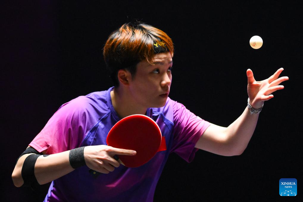 Doo Hoi Kem of China's Hong Kong hits a return during the women's singles round of 16 match against Chen Xingtong of China at the 2025 World Table Tennis (WTT) Champions Macao in Macao, south China, Sept. 12, 2025. (Xinhua/Cheong Kam Ka)