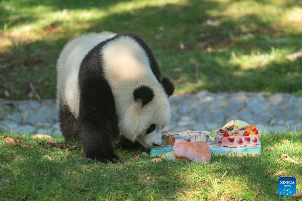 Giant panda Qing Bao eats the birthday cake during her fourth birthday's celebration at the Smithsonian's National Zoo in Washington, D.C., the United States, on Sept. 12, 2025. (Xinhua/Hu Yousong)