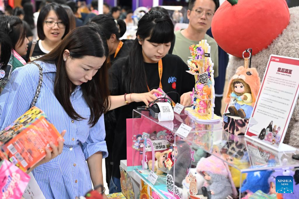 People view products of Pop Mart displayed at the 2025 China International Fair for Trade in Services (CIFTIS) in Beijing, capital of China, Sept. 12, 2025. The 2025 CIFTIS is held from Sept. 10 to 14 at the Shougang Park in Beijing. This year's fair features a wide range of cultural and creative products, which are highly popular among visitors. (Xinhua/Chen Yehua)