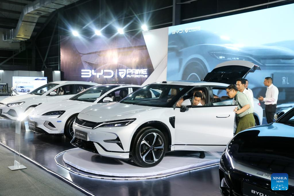 People visit the booth of BYD at the Myanmar Auto &Parts Expo 2025 in Yangon, Myanmar, Sept. 12, 2025. The expo kicked off here on Friday. (Xinhua/Myo Kyaw Soe)