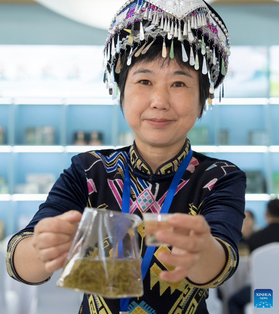 An exhibitor displays a tea product at the 19th Beijing International Tea and Tea Ceremony Exhibition at the China Agricultural Exhibition Center in Beijing, capital of China, Sept. 12, 2025. The four-day Beijing International Tea and Tea Ceremony Exhibition kicked off in Beijing on Friday, featuring tea products from more than ten production areas across the country. (Xinhua/Cai Yang)