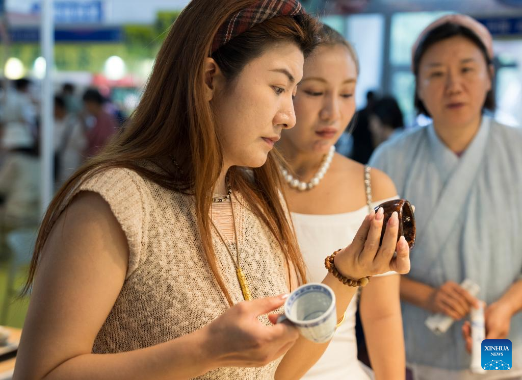 A visitor selects tea sets at the 19th Beijing International Tea and Tea Ceremony Exhibition at the China Agricultural Exhibition Center in Beijing, capital of China, Sept. 12, 2025. The four-day Beijing International Tea and Tea Ceremony Exhibition kicked off in Beijing on Friday, featuring tea products from more than ten production areas across the country. (Xinhua/Cai Yang)