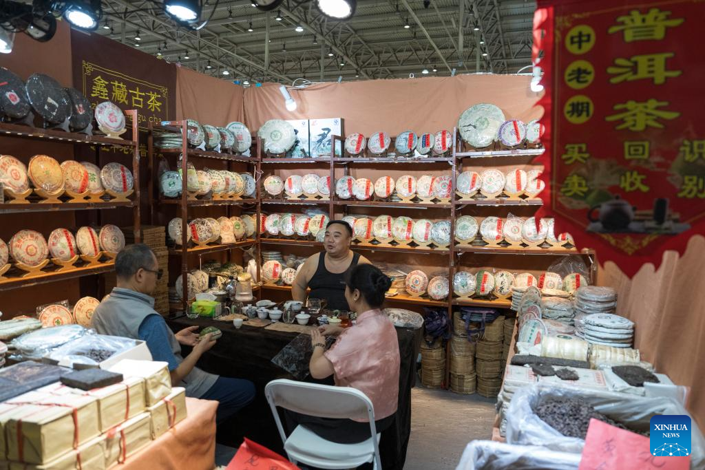 People negotiate businesses at the 19th Beijing International Tea and Tea Ceremony Exhibition at the China Agricultural Exhibition Center in Beijing, capital of China, Sept. 12, 2025. The four-day Beijing International Tea and Tea Ceremony Exhibition kicked off in Beijing on Friday, featuring tea products from more than ten production areas across the country. (Xinhua/Cai Yang)