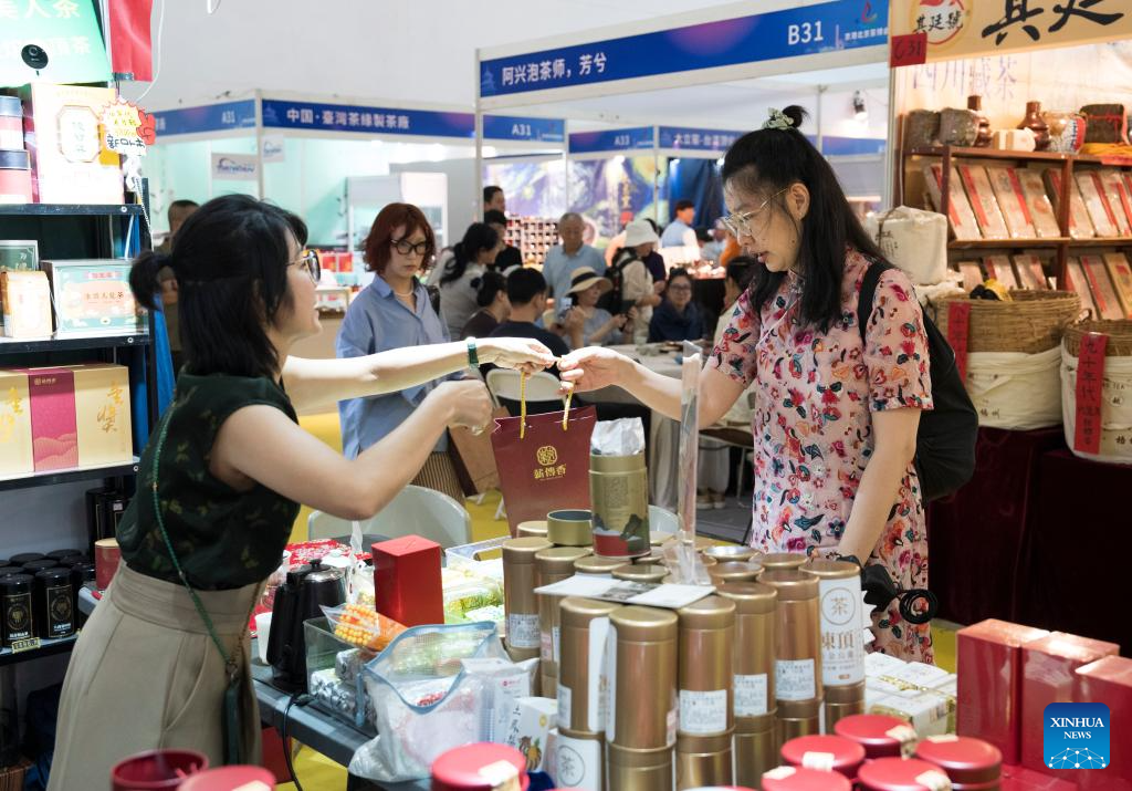 A visitor purchases oolong tea products at the 19th Beijing International Tea and Tea Ceremony Exhibition at the China Agricultural Exhibition Center in Beijing, capital of China, Sept. 12, 2025. The four-day Beijing International Tea and Tea Ceremony Exhibition kicked off in Beijing on Friday, featuring tea products from more than ten production areas across the country. (Xinhua/Cai Yang)