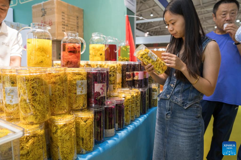 A visitor selects chrysanthemums for making drinks at the 19th Beijing International Tea and Tea Ceremony Exhibition at the China Agricultural Exhibition Center in Beijing, capital of China, Sept. 12, 2025. The four-day Beijing International Tea and Tea Ceremony Exhibition kicked off in Beijing on Friday, featuring tea products from more than ten production areas across the country. (Xinhua/Cai Yang)