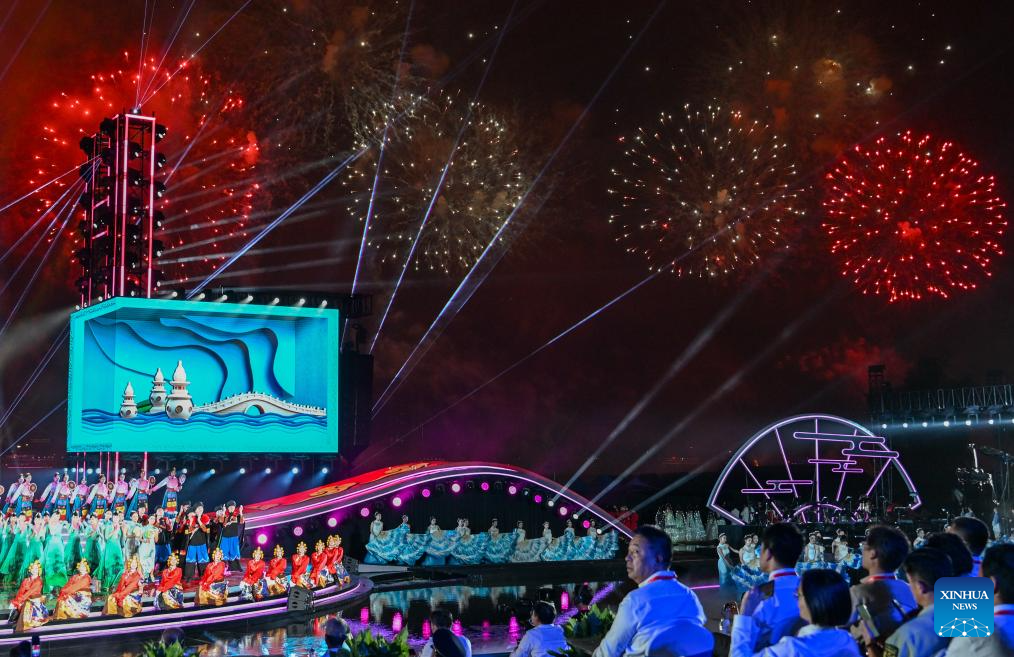 This photo taken on Sept. 12, 2025 shows fireworks during the opening ceremony of the 2025 Yangtze River cultural and arts season in Wuhan, central China's Hubei Province. The opening ceremony of the 2025 Yangtze River cultural and arts season was held in Wuhan on Friday. The event will run from Sept. 12 to Oct. 30, featuring a range of activities including art exhibitions, film week, and music week. (Xinhua/Wu Zhizun)
