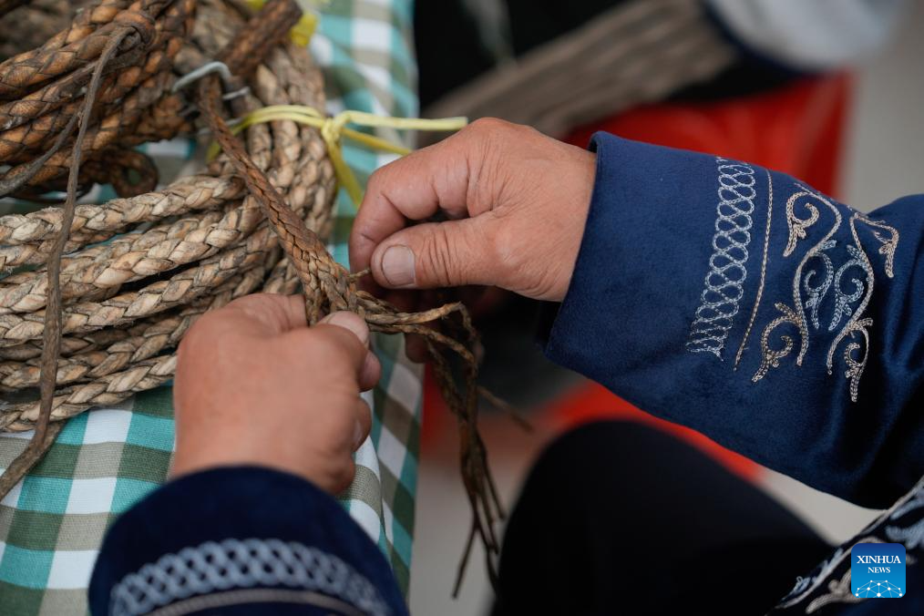 An artisan weaves a horsewhip at the Emin County memory museum in Emin County, northwest China's Xinjiang Uygur Autonomous Region, Sept. 13, 2025.