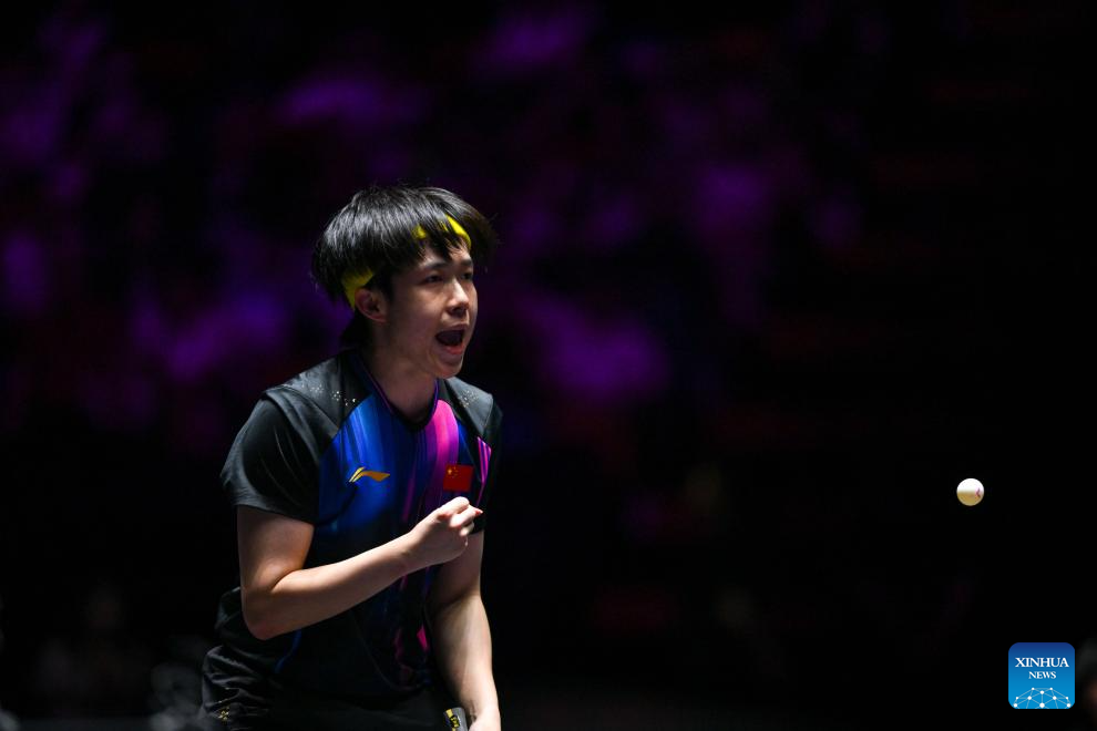 Wang Chuqin of China reacts during the men's singles final match between Wang Chuqin of China and Hugo Calderano of Brazil at the 2025 World Table Tennis (WTT) Champions Macao in Macao, south China, Sept. 14, 2025. (Xinhua/Cheong Kam Ka)