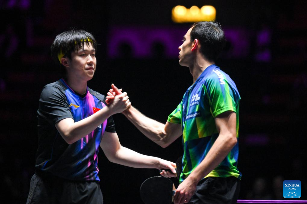 Wang Chuqin (L) of China shakes hands with Hugo Calderano of Brazil after the men's singles final match between Wang Chuqin of China and Hugo Calderano of Brazil at the 2025 World Table Tennis (WTT) Champions Macao in Macao, south China, Sept. 14, 2025. (Xinhua/Cheong Kam Ka)