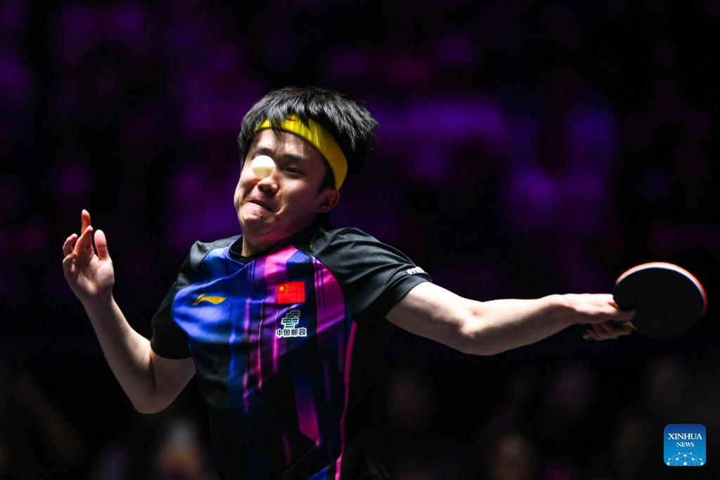 Wang Chuqin of China competes during the men's singles final match between Wang Chuqin of China and Hugo Calderano of Brazil at the 2025 World Table Tennis (WTT) Champions Macao in Macao, south China, Sept. 14, 2025. (Xinhua/Cheong Kam Ka)