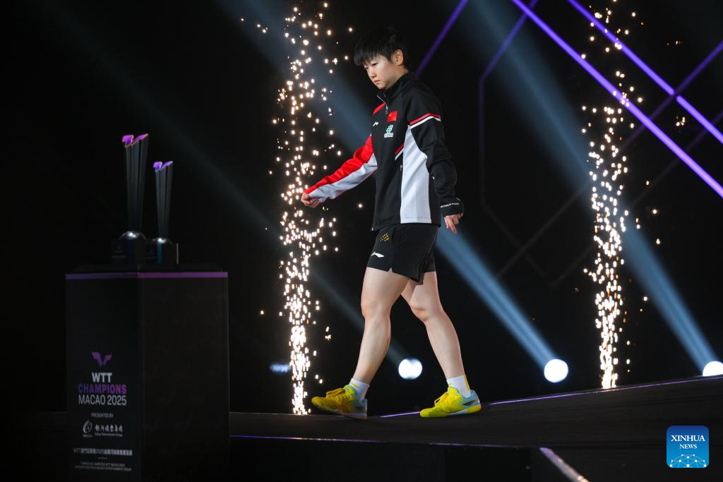 Sun Yingsha of China walks on stage before the trophy presentation after the women's singles final match against Wang Manyu of China at the 2025 World Table Tennis (WTT) Champions Macao in Macao, south China, Sept. 14, 2025. (Xinhua/Cheong Kam Ka)