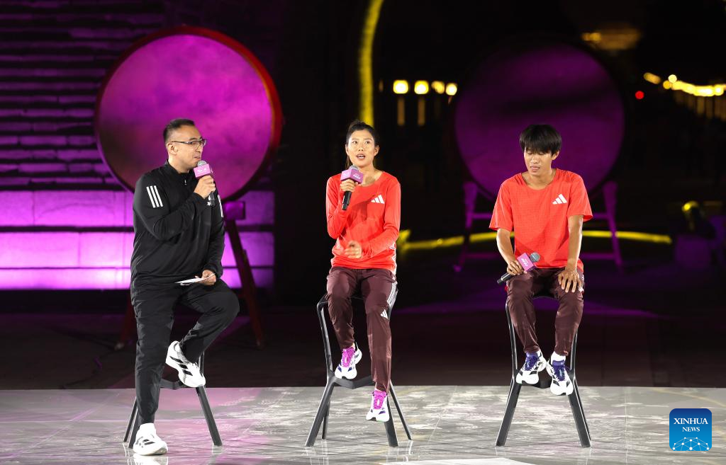 Chinese marathon athlete Li Dan (C) and Chen Yufan (R) attend the opening ceremony of Beijing Marathon Training Camp for the upcoming 2025 Beijing Marathon in Beijing, capital of China, Sept. 14, 2025. The 2025 Beijing Marathon will kick off on November 2. (Xinhua/Bai Xuefei)