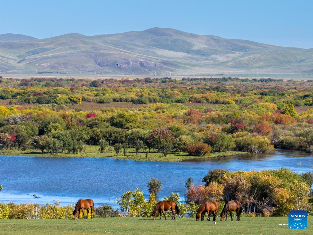 A drone photo taken on Sept. 15, 2025 shows horses grazing in the wetland around the Ergune River in Hulun Buir, north China's Inner Mongolia Autonomous Region. (Xinhua/Ma Jinrui)