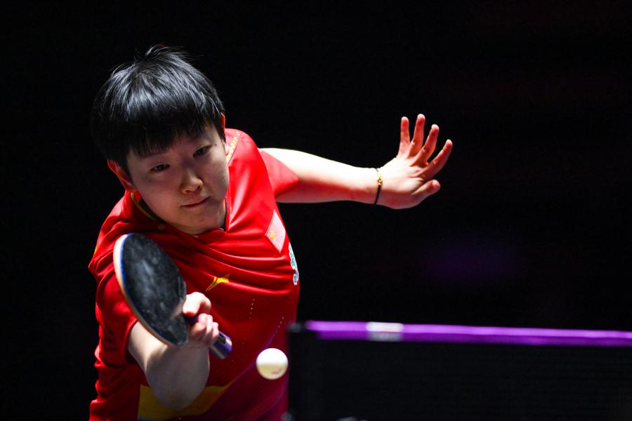 Sun Yingsha of China hits a reutrn during the women's singles final against Wang Manyu of China, Sept. 14, 2025. (Xinhua/Cheong Kam Ka)