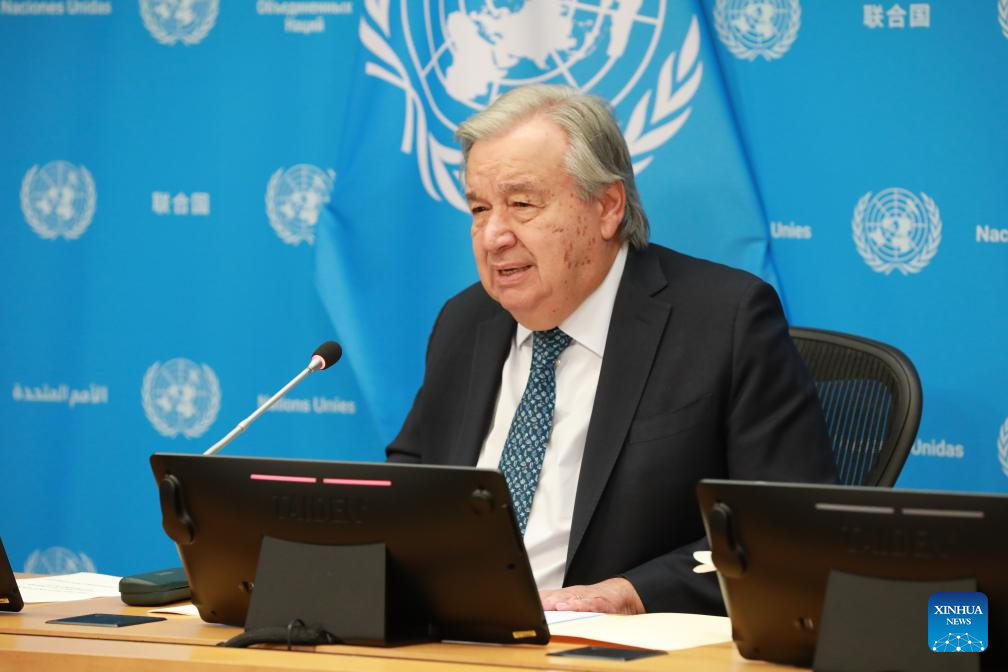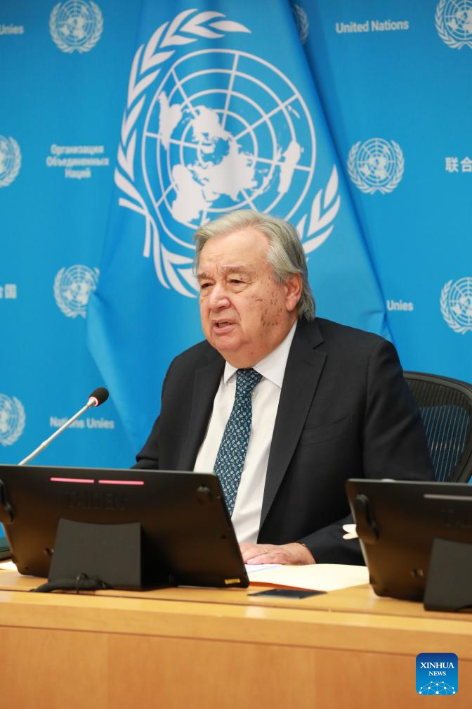 UN Secretary-General Antonio Guterres speaks to the press at the UN headquarters in New York, Sept. 16, 2025. Guterres said on Tuesday that the global initiatives proposed by China are totally compatible with the UN Charter. (Xinhua/Xie E)