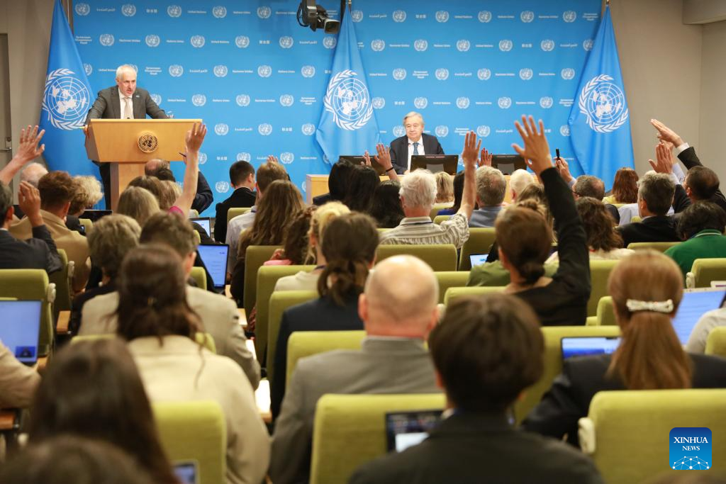 UN Secretary-General Antonio Guterres (R, Rear) holds a press briefing at the UN headquarters in New York, Sept. 16, 2025. Guterres said on Tuesday that the global initiatives proposed by China are totally compatible with the UN Charter. (Xinhua/Xie E)