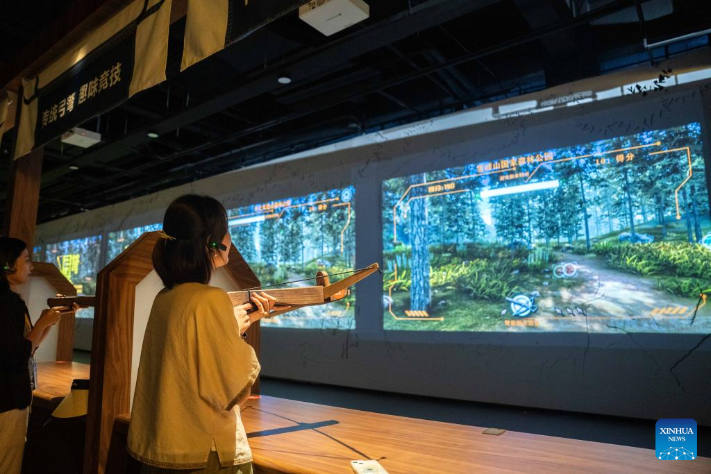 People try digital crossbow at the Wuxi Intangible Cultural Heritage Park in Hecheng District, Huaihua, central China's Hunan Province, Sept. 16, 2025.