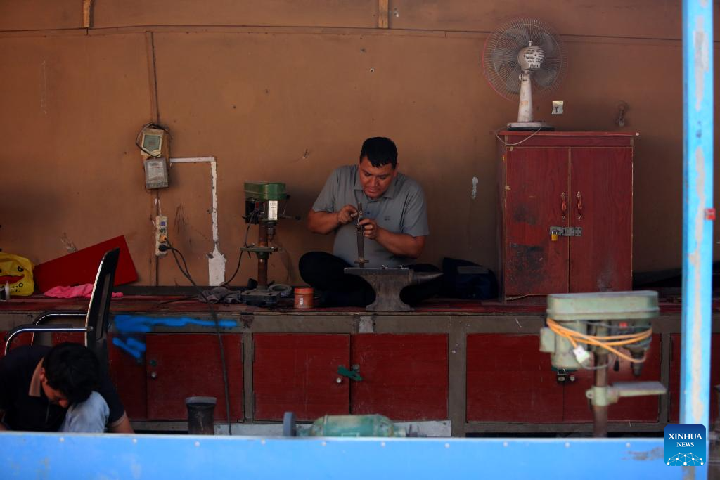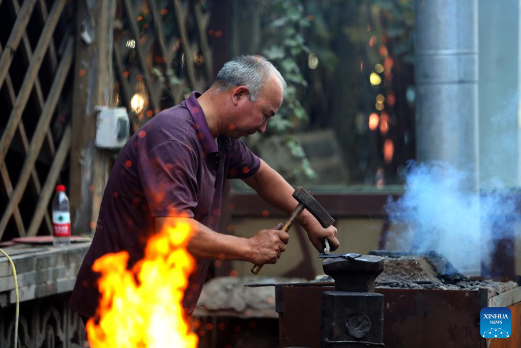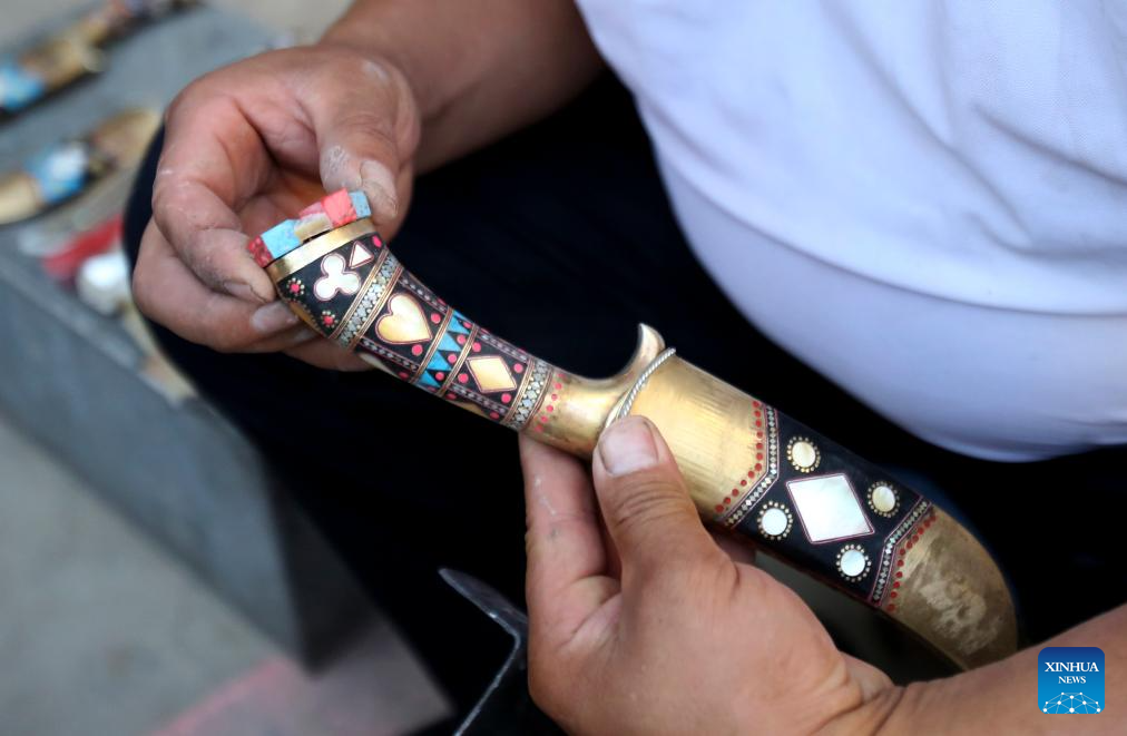A villager makes a knife in a village in Yengisar County of Kashgar, northwest China's Xinjiang Uygur Autonomous Region, Sept. 11, 2025. The Yengisar knife, a local specialty known for its exquisite shape, beautiful decoration and sharp edge, has been listed as a national intangible cultural heritage. The ancient city of Kashgar, located in southwestern Xinjiang, served as a vital transportation hub connecting China with Central Asia and South Asia in ancient times. The confluence of diverse ethnic cultures in this region has given rise to a wealth of historical and cultural treasures.