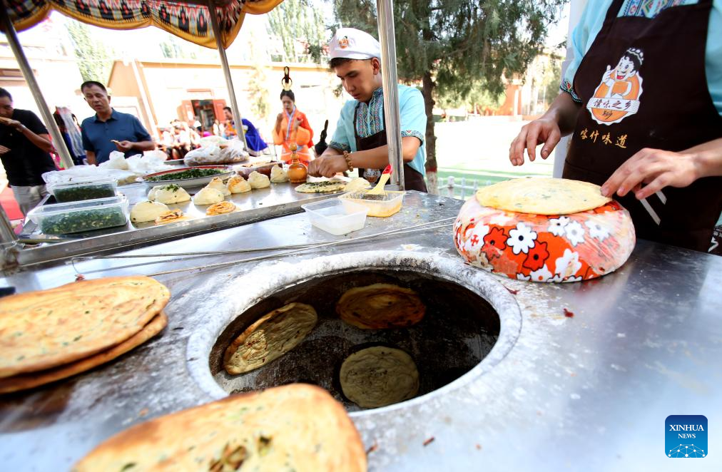 Villagers make naans for tourists in a village in Yengisar County of Kashgar, northwest China's Xinjiang Uygur Autonomous Region, Sept. 11, 2025. The ancient city of Kashgar, located in southwestern Xinjiang, served as a vital transportation hub connecting China with Central Asia and South Asia in ancient times. The confluence of diverse ethnic cultures in this region has given rise to a wealth of historical and cultural treasures.