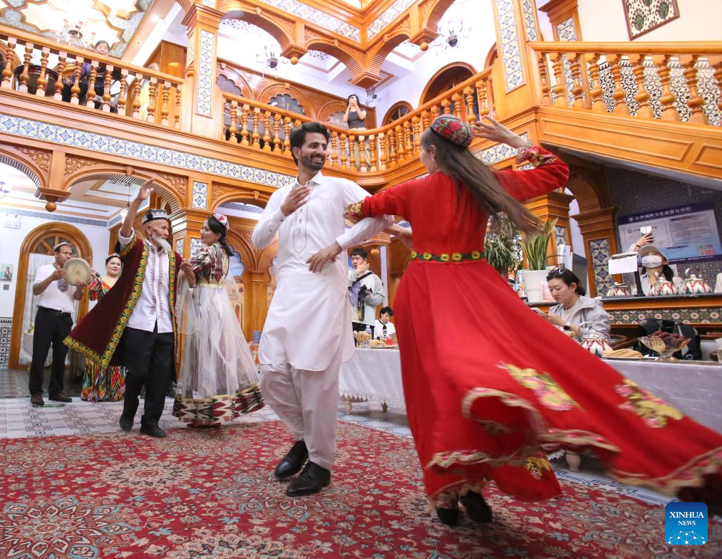 A Pakistani tourist (2nd R, front) dances with a staff member at a homestay, in the Kashgar Ancient City scenic spot, northwest China's Xinjiang Uygur Autonomous Region, Sept. 10, 2025. The ancient city of Kashgar, located in southwestern Xinjiang, served as a vital transportation hub connecting China with Central Asia and South Asia in ancient times. The confluence of diverse ethnic cultures in this region has given rise to a wealth of historical and cultural treasures.