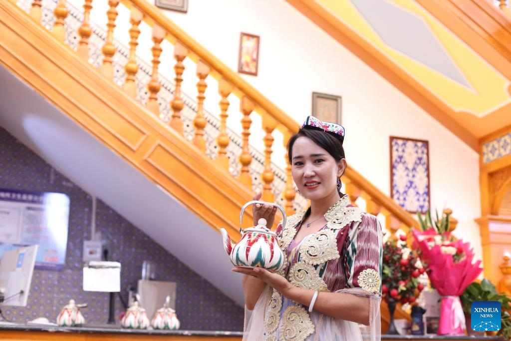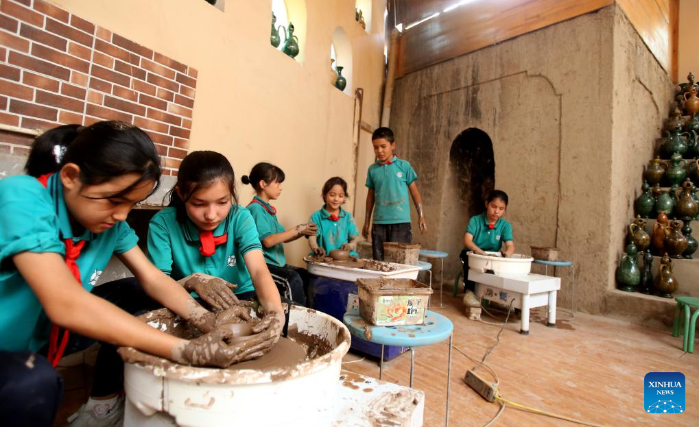 Students make pottery wares in a village in Yengisar County of Kashgar, northwest China's Xinjiang Uygur Autonomous Region, Sept. 11, 2025. The ancient city of Kashgar, located in southwestern Xinjiang, served as a vital transportation hub connecting China with Central Asia and South Asia in ancient times. The confluence of diverse ethnic cultures in this region has given rise to a wealth of historical and cultural treasures.