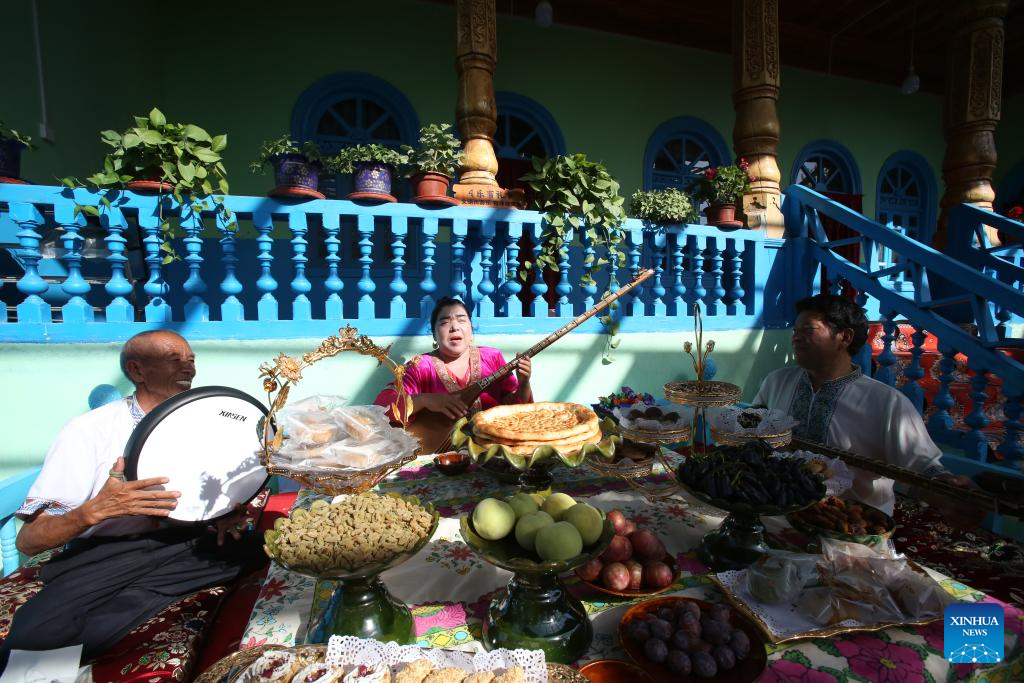 Villagers perform for tourists in a village in Yengisar County of Kashgar, northwest China's Xinjiang Uygur Autonomous Region, Sept. 11, 2025. The ancient city of Kashgar, located in southwestern Xinjiang, served as a vital transportation hub connecting China with Central Asia and South Asia in ancient times. The confluence of diverse ethnic cultures in this region has given rise to a wealth of historical and cultural treasures.