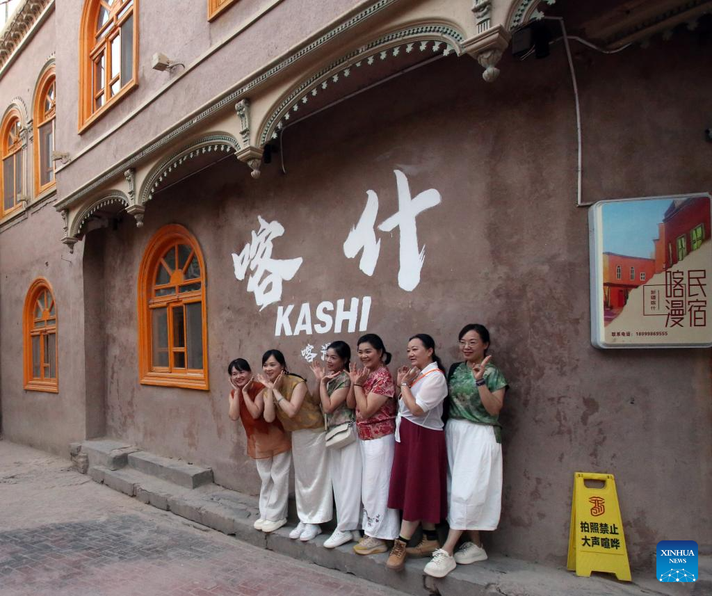 Tourists pose for a group photo at the Kashgar Ancient City scenic spot, northwest China's Xinjiang Uygur Autonomous Region, Sept. 10, 2025. The ancient city of Kashgar, located in southwestern Xinjiang, served as a vital transportation hub connecting China with Central Asia and South Asia in ancient times. The confluence of diverse ethnic cultures in this region has given rise to a wealth of historical and cultural treasures.