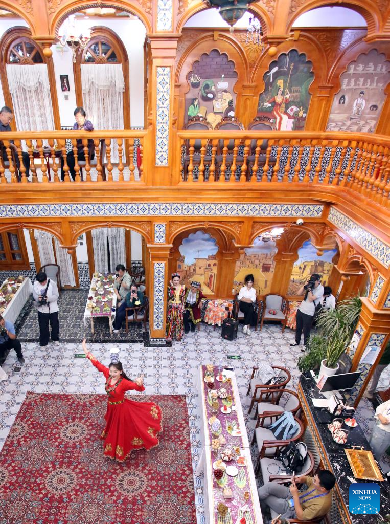 Tourists watch a performance at a homestay, in the Kashgar Ancient City scenic spot, northwest China's Xinjiang Uygur Autonomous Region, Sept. 10, 2025. The ancient city of Kashgar, located in southwestern Xinjiang, served as a vital transportation hub connecting China with Central Asia and South Asia in ancient times. The confluence of diverse ethnic cultures in this region has given rise to a wealth of historical and cultural treasures.